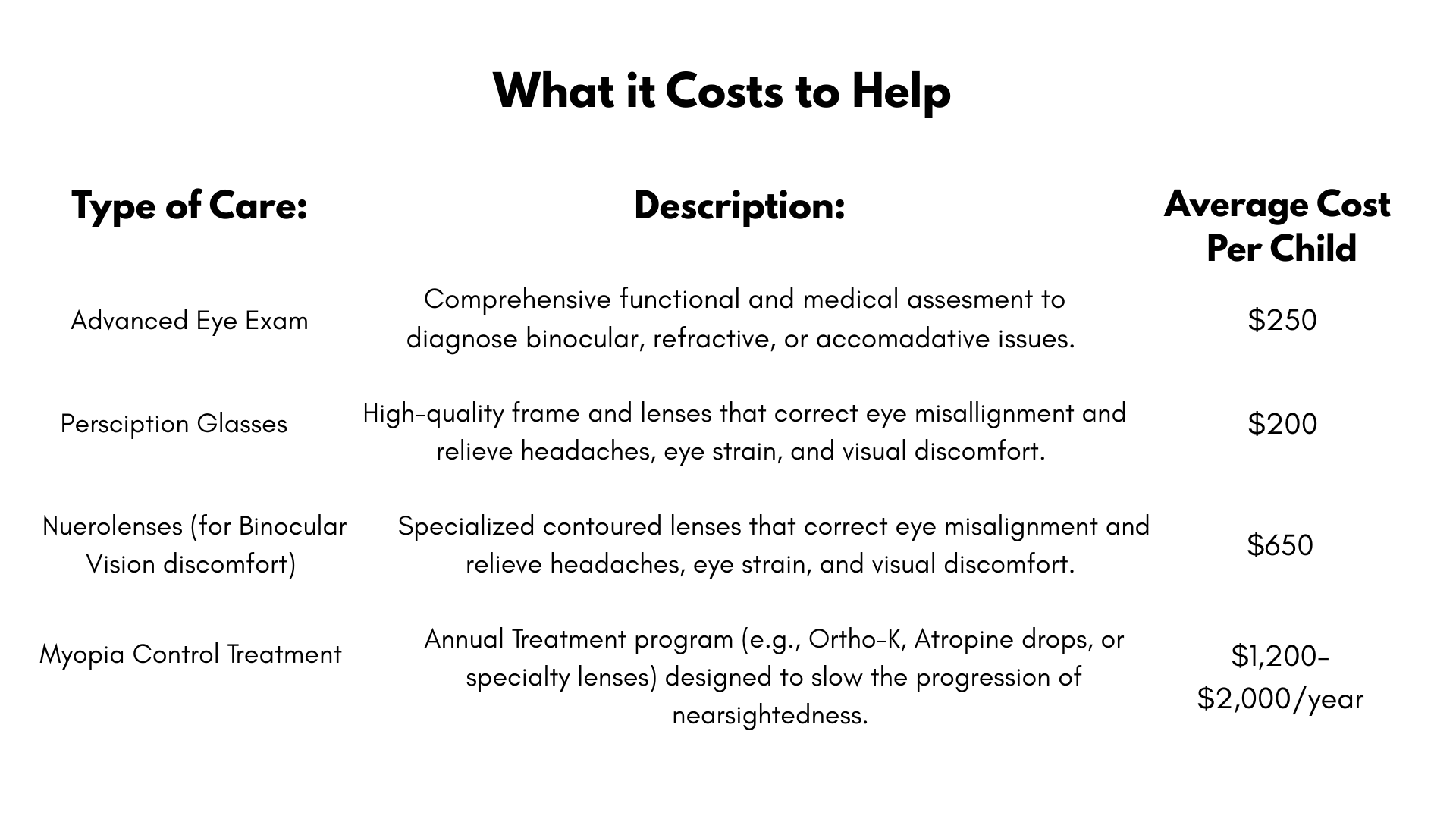 These figures show how quickly the cost of eye exams and treatments can become a barrier for families. Without support, many children may miss out on essential care or delay treatment altogether. Reducing this financial burden allows children to access the care they need, when they need it.